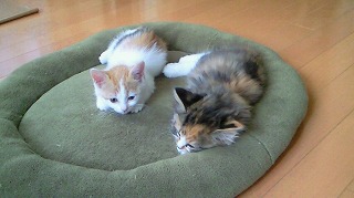 沢山遊んだちびにゃん達は、またまた悩殺ポーズでお休み中。