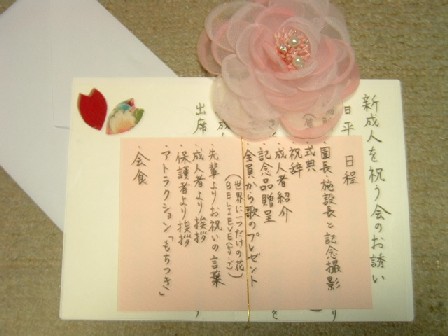 世の中には、成人式で騒ぐ若者が話題になったり、成人式そのものの意義を考え直す方もありますが、私はこの本当に手作りで心温まるこのお祝いを娘の成長と共に今から胸が一杯で、ここまで育てられたのも皆さんのお力あってこそと心から感謝しています。そういう節目のこのお祝いの会は一生大事な思い出になると思います。