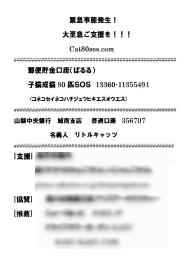 ←振込先はあっていますので、募金詐欺ではありませんが、リトルの関係者(私も含め、一時預かりさん)、またリトルを応援してくださる方などが一切このような行為はしておりません。